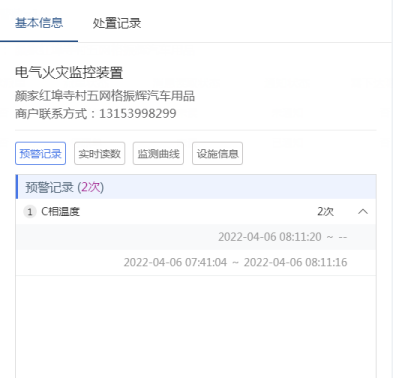 接收到此預(yù)警后中心值守人員立即撥打此商戶電話,通知該商戶業(yè)主,告知商戶線纜溫度異常過高,具有重大安全隱患,請(qǐng)其立刻停止大功率用電器并斷電,并讓該業(yè)主立刻通知電工前往處置,隨即派單中心巡檢人員,讓其立刻前往現(xiàn)場(chǎng)復(fù)核處置該預(yù)警。