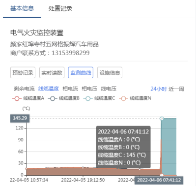 2022年04月06日07點(diǎn)41分04秒,蘭山街道智慧消防中心(以下簡(jiǎn)稱“中心”)一級(jí)平臺(tái)接收到顏家紅埠寺村五網(wǎng)格振輝汽車用品商鋪中安裝的智慧用電設(shè)備發(fā)出的溫度預(yù)警。