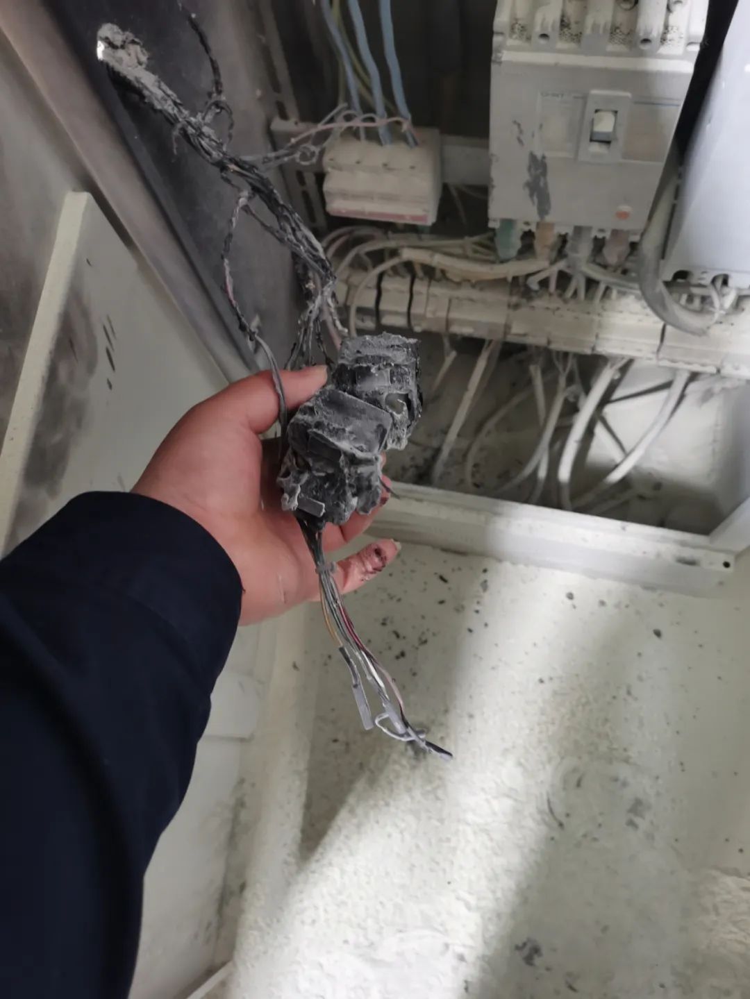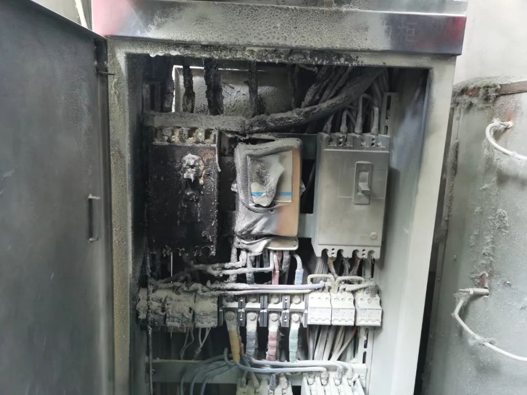 當(dāng)中心巡檢人員抵達(dá)現(xiàn)場(chǎng)時(shí),老板正在處置,隨即巡檢人員協(xié)助老板處置,發(fā)現(xiàn)該商戶配電箱內(nèi)空開與電線已經(jīng)燒焦。