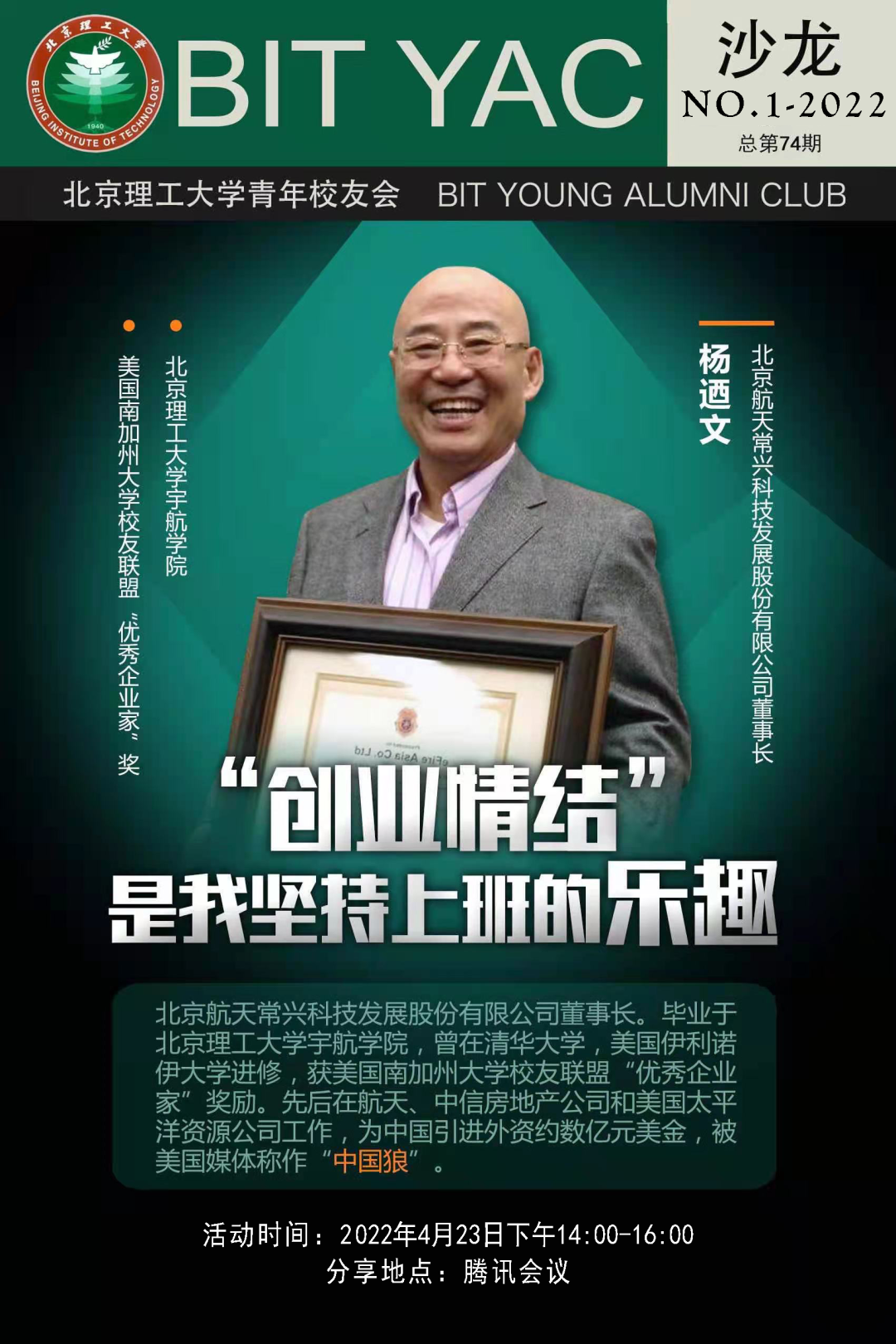 2022年4月23日下午,受疫情影響闊別已久的青年匯校友沙龍?jiān)俣乳_(kāi)啟。本期邀請(qǐng)63級(jí)導(dǎo)彈總體專(zhuān)業(yè)楊迺文校友帶來(lái)“‘創(chuàng)業(yè)情結(jié)’是我堅(jiān)持上班的樂(lè)趣”主題分享,40多位北理工校友在騰訊會(huì)議上“云相聚”。