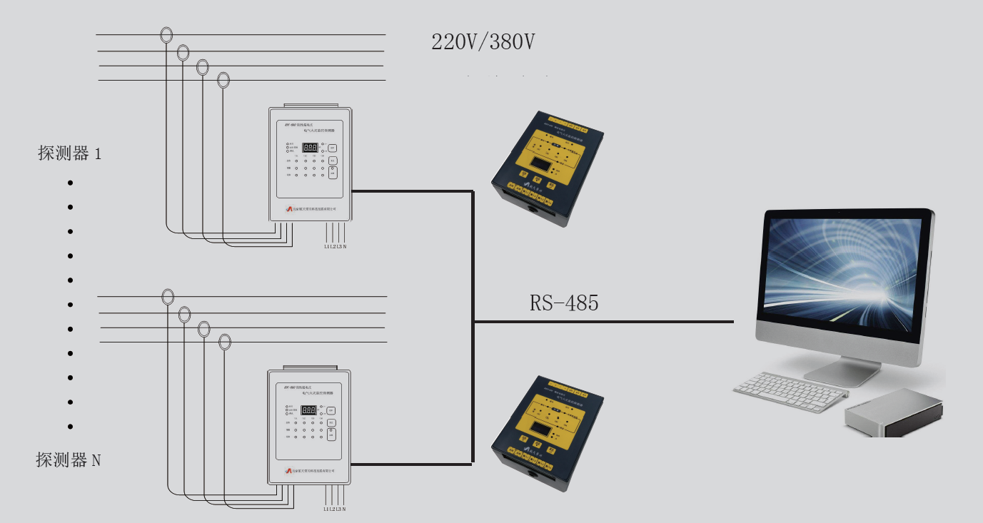■ 一臺探測器可同時(shí)監(jiān)測四條線纜,多臺探測器與監(jiān)控設(shè)備構(gòu)成完整的電氣火災(zāi)監(jiān)控系統(tǒng)
